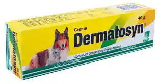 Composición: Cada 100 g contienen: Isoconazol nitrato …………………… 2 g. Gentamicina (sulfato) ………………… 0,3 g. Dexametasona …………………….. 0,04 g. Excipientes c.s.p. …………………..100 g. Uso e indicaciones: Dermatosyn es una crema Polivalente de uso dermatológico y en otitis externa para Caninos y gatos. Dermatosyn actúa contra bacterias: Sthaphylococcus sp, Streptococcus sp, Aerobacter sp, Klepsiella sp, Shiguella sp, Eschericihia coli y en hongos: Trycophyton verrucosum, T mentagrophytes, Epidermophyton floccosum, Microsporum canis, Candida albicans.Vía de administración: Uso tópico, Presentaciones: Tubo colapsible por 40 g,Dosis e indicaciones: Dermatosyn es de aplicación tópica sobre la piel afectada. Se recomienda aplicar por varios días después de la desaparición de los síntomas para asegurar el éxito en el tratamiento.Especies: Caninos y gatos,Uso médico: Crema dermatológica.