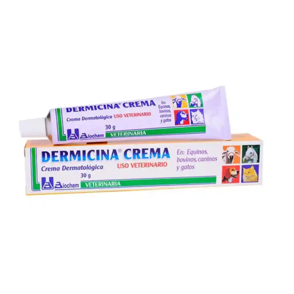 USO EN: Bovinos, equinos, caninos y felinos. INDICACIONES: Dermatitis causadas por gérmenes sensibles al Clotrimazol y a la Neomicina: Hongos: Cándida albicans, Trichohyton verrucosum, T. rubrum, T. mentagrophytes, Epidermophyton flocosum, Microsporum canis. Bacterias: Gram- positivas y Gram-negativas: Escherichia coli, Staphylococcus, Klebsiella sp, Aerobacter sp., Shigella sp. DESCRIPCIÓN: DERMICINA ® crema, combina 3 componentes con efecto antibiótico, antimicótico, antiinflamatorio y antialérgico. Tratamiento de elección en dermatitis complicadas por infecciones causadas por dermatofitos, levaduras y mohos. PROPIEDADES: Clotrimazol: antimicótico imidazolico de amplio espectro. Se une a la enzima citocromo P450, necesaria para la síntesis de ergosterol, altera la permeabilidad de pared celular y membranas de los organelos intracelulares, bloquea la capacidad de división celular y la formación de la pared de la célula del hongo. Por otra parte acumula esteroles anómalos y contribuye a la fragilidad y muerte celular. Promueve la pérdida de compuestos de Fósforo, produce la descomposición de ácidos nucleicos celulares y causa aceleración en la salida de Potasio. Neomicina: Bactericida aminogucósido de amplio espectro. Entra a la bacteria y se une irreversiblemente a receptores presentes en la subunidad 30S ribosomal. Esta unión interfiere con el complejo de iniciación entre el ARN mensajero (ARNm) y la subunidad 30S. Debido a la mala interpretación del ADN bacteriano, se forman proteínas anormales no funcionales. Dexametasona: Potente antiinflamatorio esteroidal. Evita la alergia y el prurito para impedir que los animales se automutilen. Neutraliza los signos cardinales de la inflamación (dolor, calor, rubor, tumefacción y pérdida de la función). Tratamiento de elección en quemaduras y en lesiones por rayos solares. Mecanismo de acción: Estabiliza membranas, bloquea a la lipooxigenasa y evita la síntesis de prostaglandinas. VÍA DE APLICACIÓN y DOSIS: Aplicar uniformemente sobre todas las zonas afectadas de 2 a 3 veces al día. El alivio sintomático se obtiene en pocos días sin embargo, para evitar repetir la enfermedad, el tratamiento debe hacerse durante 8 días en caso de dermatitis bacterianas y durante 45 a 60 días en caso de infecciones por hongos, con el objetivo de lograr una completa recuperación.