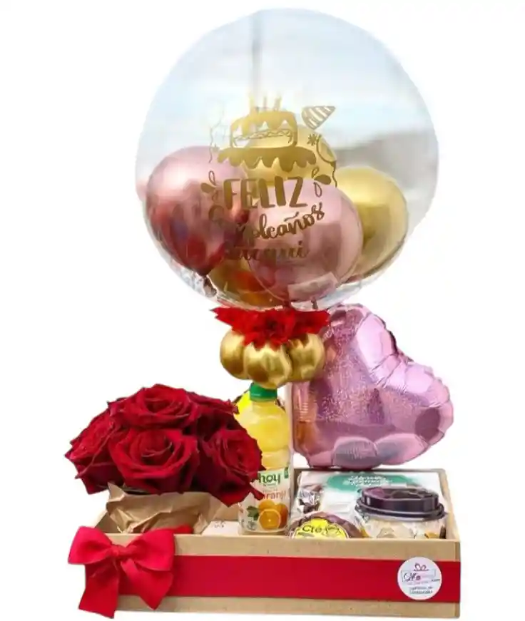 DESAYUNO SOPRESA CON { SÁNDWICH, ENSALADA DE FRUTAS , JUGO DE NARANJA , YOGUR, ROSAS ROJAS , GLOBO TRASPARENTES CON GLOBOS METALIZADOS PORDENTRO , GLOBOS DE CORAZON , CAJA DE COLOR MADERA CON SINTA Y MOÑO DE DECORACION } POR FAVOR HACER EL PEDIDO UN DIA ANTES O DOS HORAS DE ANTISIACION GRACIAS