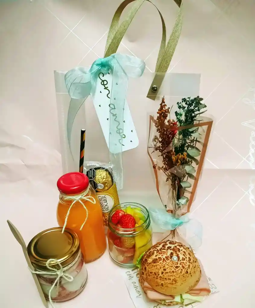 Desayuno - Brunch amor al natural, este delicioso detalle es ideal para compartir a cualquier hora del día, contiene un mini sandwich, mix de frutas, postre de frutos rojos, jugo de mandarina, cubiertos, ramito de flores secas , en bolsa opalizada con tarjeta. Desayunos Brunch Cumpleaños Amor Amistad novios Día del bombero Aguinaldo Aniversario