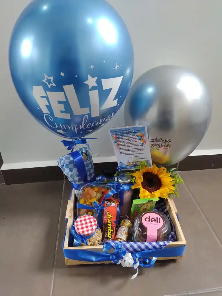 Incluye Dos globos festivos: uno azul con 'Feliz Cumpleaños' y uno plateado con mensaje según celebración - Selección de frutas frescas mix - Variedad de dulces: barra de chocolate Jumbo, bombones Ferrero Rocher, galleta y bizcocho Deli - Incluye dos bebidas yogurt y jugo de naranja - Decorado con un hermoso girasol natural - Presentado en una caja de madera con detalles en azul y blanco - Tarjeta de felicitación según celebracion Indicar en la app por medio de solicitud especial o simplemente en el chat del delivery.