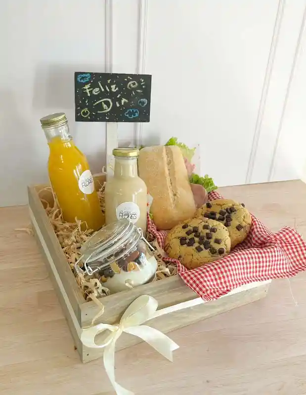 DESAYUNO SORPRESA COMPUESTO POR SANDWICH JAMON Y QUESO, BEBIDA FRIA (JUGO) YOGURT DE FRUTA, PORCION DE FRUTA, CEREAL, CAJA DE MADERA, GLOBO, MOÑO Y TARJETA