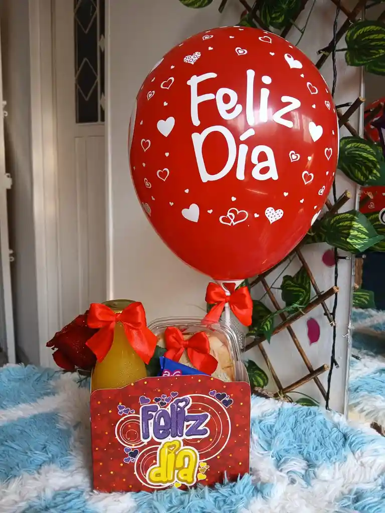 Caja con 1 rosa, sandwich de tocineta o huevos rancheros (escoges uno de los dos), jugo de naranja natural, corazón de hojaldre, decorada con globo, moño y tarjeta.