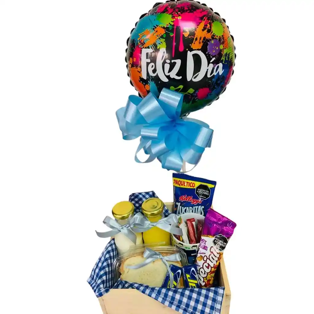 Base de madera con botella de jugo y de leche, pocillo con sobres de café y aromática, sándwich casero, maní, chocolatina y cereales. Decorado con globo, mantel y moño