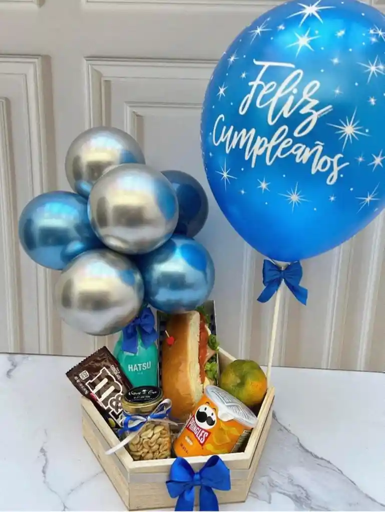 Fruta cortada Zumo de naranja Sándwich de pollo Cupcake Bebida caliente Postre Ferrero por 3 Globo metalizado Caja de madera
