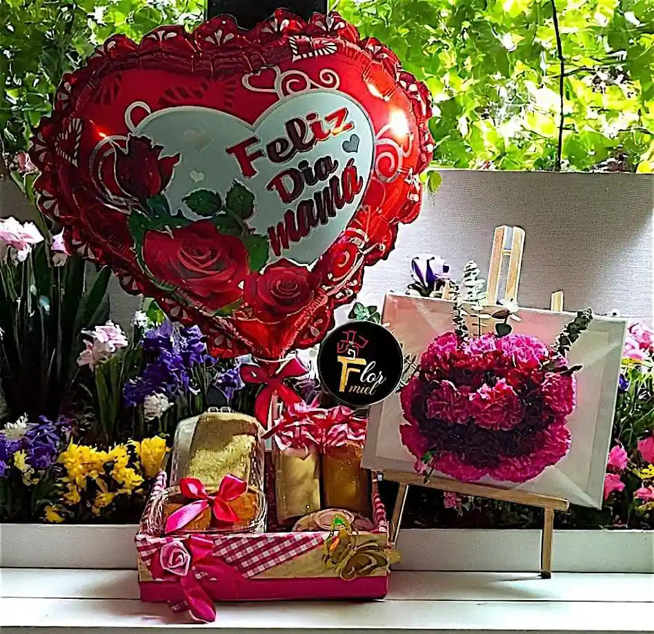 Contiene: sandwich gourmet de jamón y queso, jugo natural, capuchino, ensalada de frutas con dos toppings: queso y coco, torta personal, (1) globo metalizado de acuerdo a la ocasión, tela picnic, bandeja de madera, moño y tarjeta. Cuadro con arreglo floral, tal como se muestra la decoración en la foto. Nota: Por favor colocar en la descripción ocasión para elegir el globo y mensaje para poner en la tarjeta (quien lo envía y quien recibe).