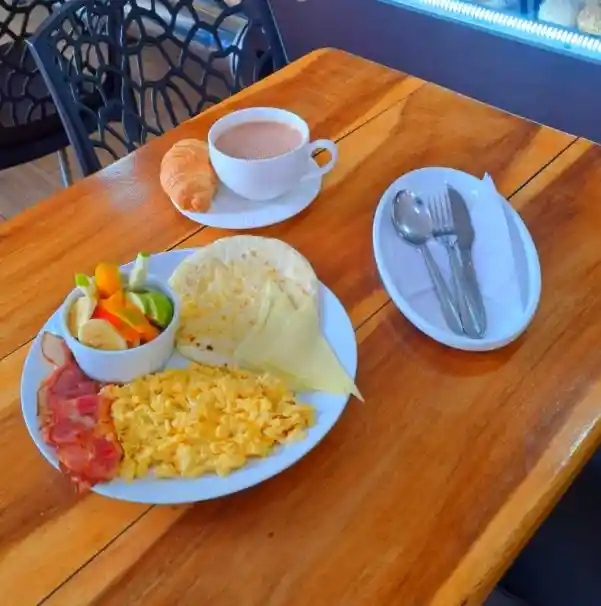 - Porción de Tres Huevos Espumados - Porción de Tocineta - Porción de Queso Doble Crema - Porción de Fruta de Temporada - Arepa de Maíz - Pancito Hojaldrado - Bebida Caliente (Chocolate en Agua/Leche; Cafe Oscuro / Leche)
