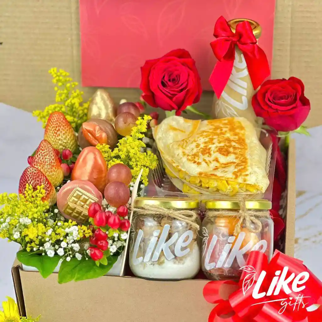 Expresa tu gratitud de una manera inolvidable con nuestro desayuno Gratitud, una sinfonía de sabores únicos que deleitarán todos los sentidos. Este desayuno es una expresión de gratitud en forma de sabores únicos. Regálalo a alguien especial y déjales saber cuánto aprecias su presencia en tu vida. Contenido: 1 Arreglo floral con frutas y fresas cubiertas de chocolate. 2 Quesadillas de pollo y maicitos horneadas. 1 Frasco de maridaje (jamones, quesos y frutas). 1 Parfait (Yogurt griego y granola). 1 Capuccino 300ml. 1 Tarjeta personalizada. Decoración con flores. Presentación: Caja cerrada con moño.