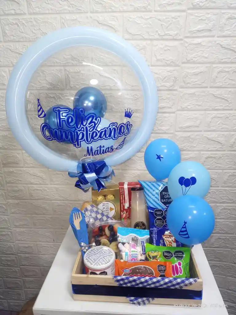 Cesta de cumpleaños, incluye globos premium, mix de fruta, sanduche cubano jamón, chocolates Ferrero x8,, barquillo, ponqué submarinos, chocorramo, gomitas, papas jumbo y tarro y bebida milo. Ideal para celebrar con alegría.