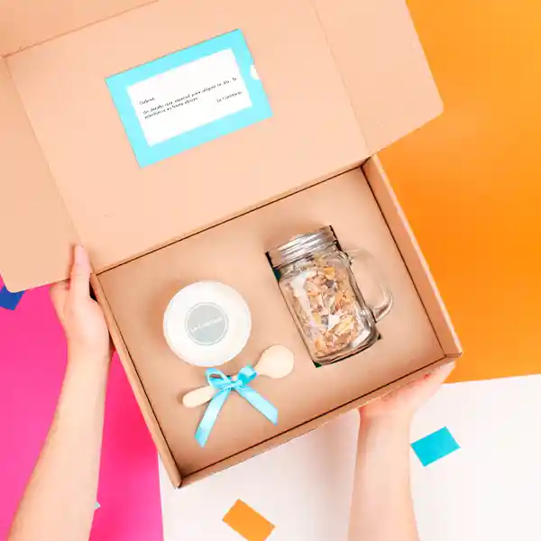- Jarro de vidrio con tapa - Cuchara de madera - Yogur griego - Granola - Tarjeta con mensaje personalizado - Cierre con papel fino y sello tipo lacre