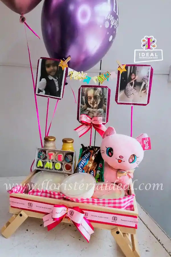 Delicioso y tierno desayuno sorpresa con lindo peluche de gato Incluye: *Ensalada de Frutas *Sándwich de Pollo *Postre *Jugo de Naranja *Milo *Kellogg´s *Bon yourt *3 Fotos personalizadas *Base de madera tipo Mesa