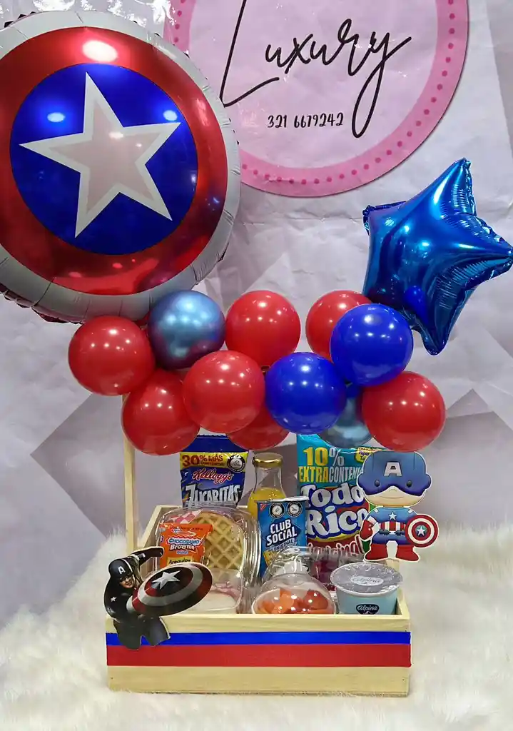 Globo metalizado 23” Globo metalizado 10” 12 globos R5 Pin de madera Decoración a elección Caja de madera decorada Waffles Sándwich Fruta picada Postre personal Kumis Kellogg’s Todo rico Jugo de naranja en frasco de vidrio Mini browny Chocolatina