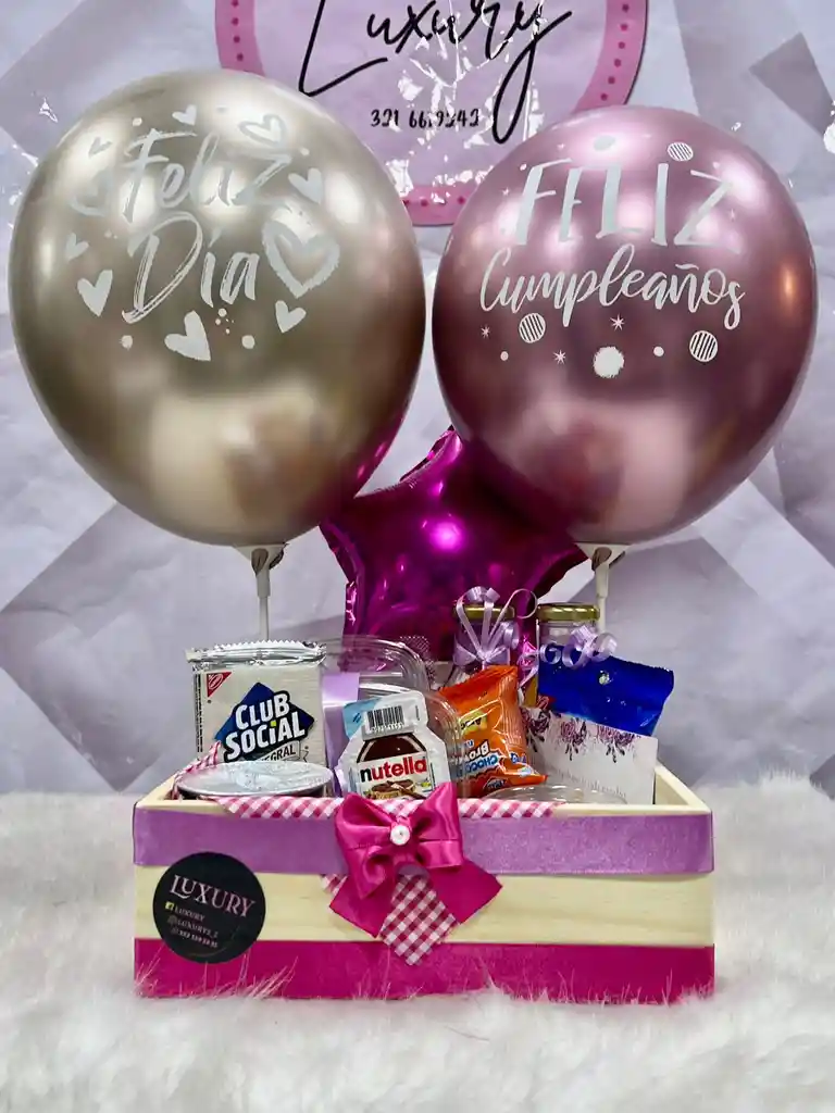 Sándwich Jugo de naranja en frasco de vidrio Paquete de galletas oreo Fruta entera Parfait Postre personal Pancake con chocolate yogurt alpina Leche en tarro de vidrio Caja decorada 2 globos R 12