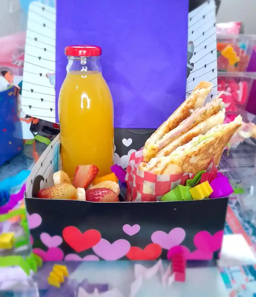 INCLUYE: Caja + tarjeta Sándwich cubano (jamón de cerdo, queso mozzarella, lechuga batavia y salsa de la casa) Bebida (botella de vidrios con jugo natural de naranja o mandarina o yogourt) Ensalada de frutas (mango, fresas,piña y banano)