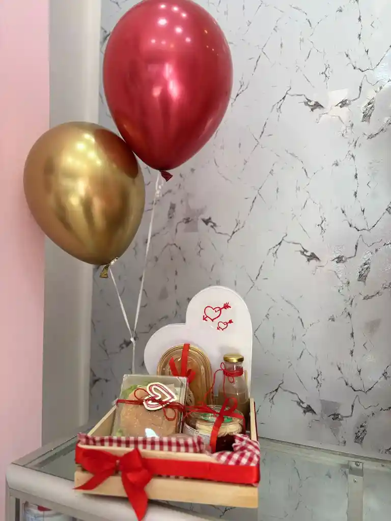 Sorprende con desayuno único y especial en este amor amistad. Incluye: - Sandwich - Waffles - Milo - Torta personal - Parfait - fruta - Vela aromatizante - 2 globos con helio Si deseas incluir tarjeta escribirla por medio de mensajes.