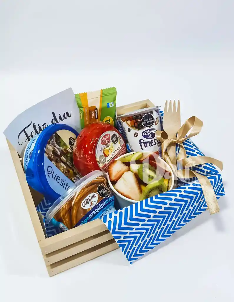Incluye: 1 Porcion de fruta, 1 arequipe alpina, 1 quesito alpina, 1 yogurt finesse, 1 queso holandes, 1 galletas tosh, Cubierto y pitillo biodegradable, 1 tarjeta dedicatoria, canasta, mantel y lazos decorativos. Por favor confirmar mensaje de la tarjeta dedicatoria por el chat de la orden, de no ser así, irá una tarjeta genérica. *Contemplar por favor el tiempo de elaboración del detalle ya que se realiza al momento de usted hacer el pedido y programarlo con anticipación.