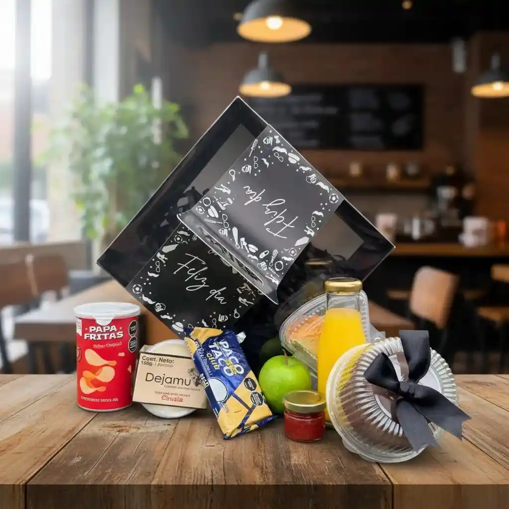 Incluye: Caja negra, Sandwish, jugo natural, Papas fritas, Griego, Fruta, Galletas, mermelada y Torta personal