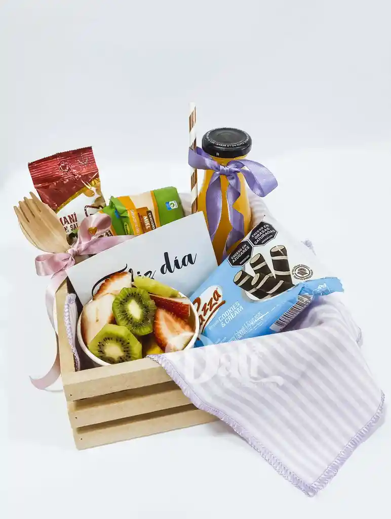 Incluye: 1 jugo de naranja, 1 porción de fruta, 1 maní salado, 1 galletas tosh, 1 piazza, Cubierto y pitillo biodegradable, 1 tarjeta dedicatoria, canasta, mantel y lazos decorativos. Por favor confirmar mensaje de la tarjeta dedicatoria por el chat de la orden, de no ser así, irá una tarjeta genérica. *Contemplar por favor el tiempo de elaboración del detalle ya que se realiza al momento de usted hacer el pedido y programarlo con anticipación.