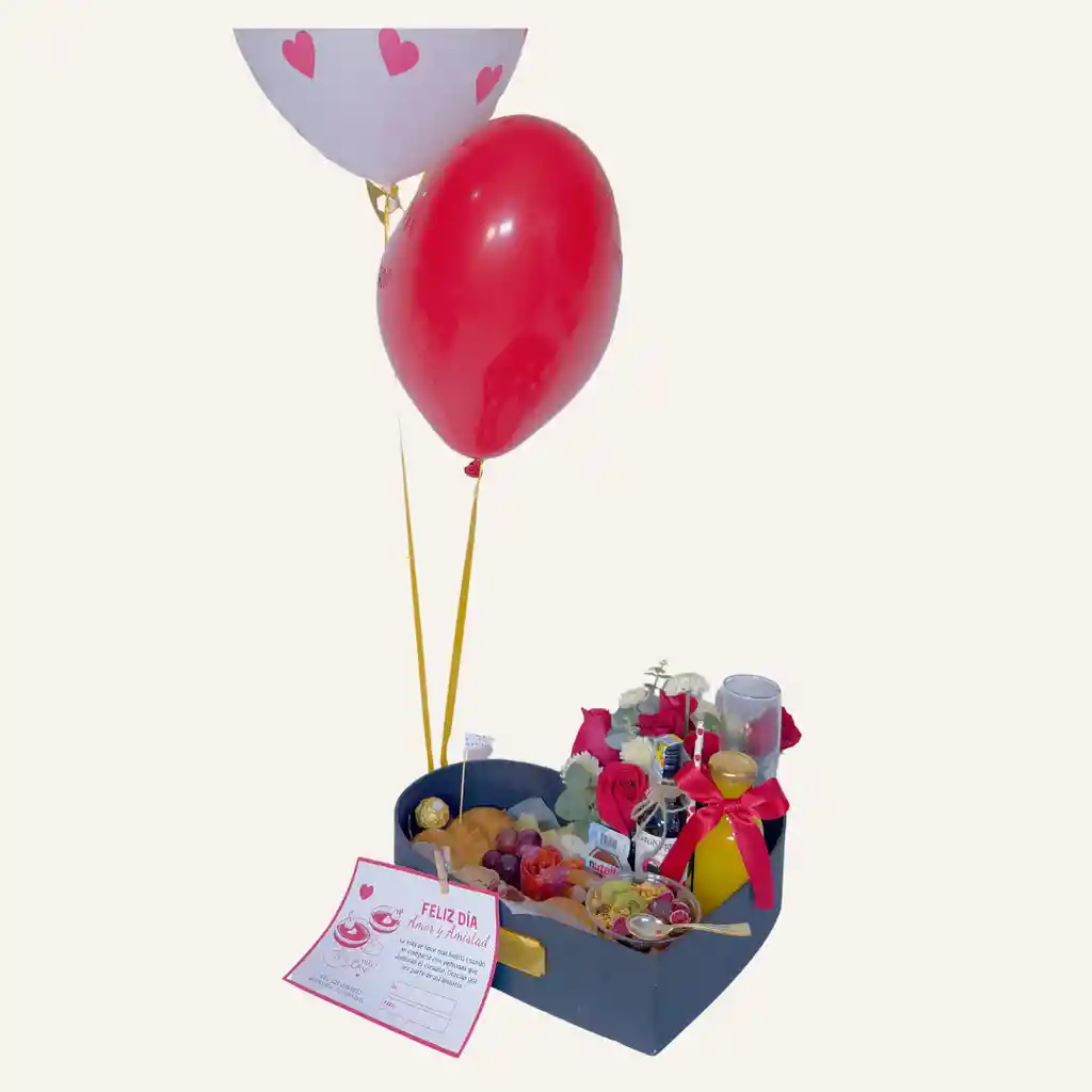 Un corazón de delicias para este Amor y Amistad. 3 Croissants, parfait artesanal, uvas, porción queso crema, frambuesas cubiertas de chocolate,mix de quesos, nutella mini, mermelada de mora, jugo de naranja fresco,copa y vino gato negro, ramo de rosas y dos globos en helio certificado.Tarjeta con dedicatoria.