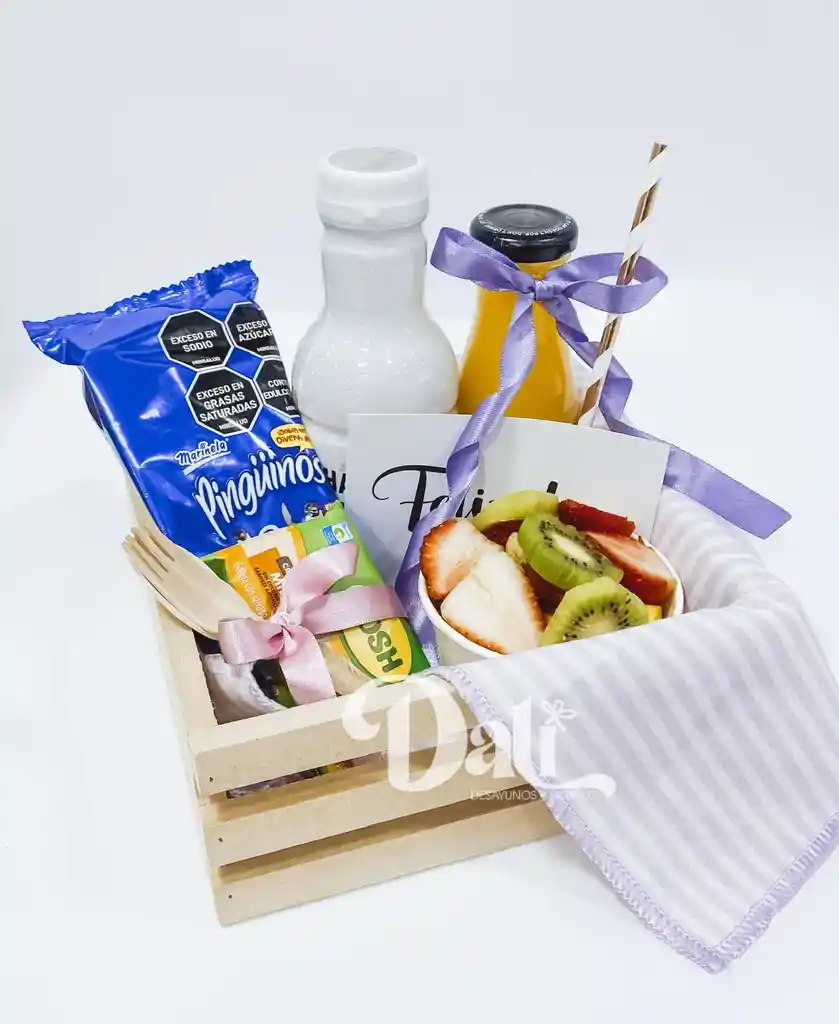Incluye: 1 Jugo de naranja, 1 Porcion de fruta, 1 Hatsu Te, 1 Ponque Pingüinos, 1 Galletas Tosh, Cubierto y pitillo biodegradable, 1 tarjeta dedicatoria, canasta, mantel y lazos decorativos. Por favor confirmar mensaje de la tarjeta dedicatoria por el chat de la orden, de no ser así, irá una tarjeta genérica. *Contemplar por favor el tiempo de elaboración del detalle ya que se realiza al momento de usted hacer el pedido y programarlo con anticipación.