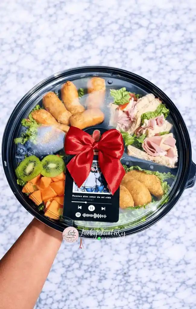 Bandeja con empanada coctelera, dedos de queso, mix de frutas, sándwich en triángulos y detalles personalizados, perfecta para sorprender con un regalo especial 🎁