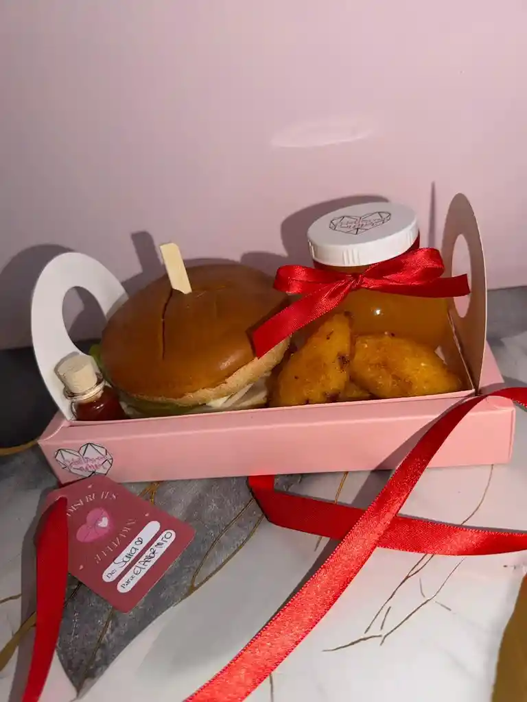 Un detalle lleno de amor y sabor, te sacara de apuros. Te incluye sándwich gourmet, jugo de naranja en recipiente plástico, 3 mini empanaditas, pócima de salsa roja. Puedes personalizar el color de la decoración y la tarjeta con mensaje.