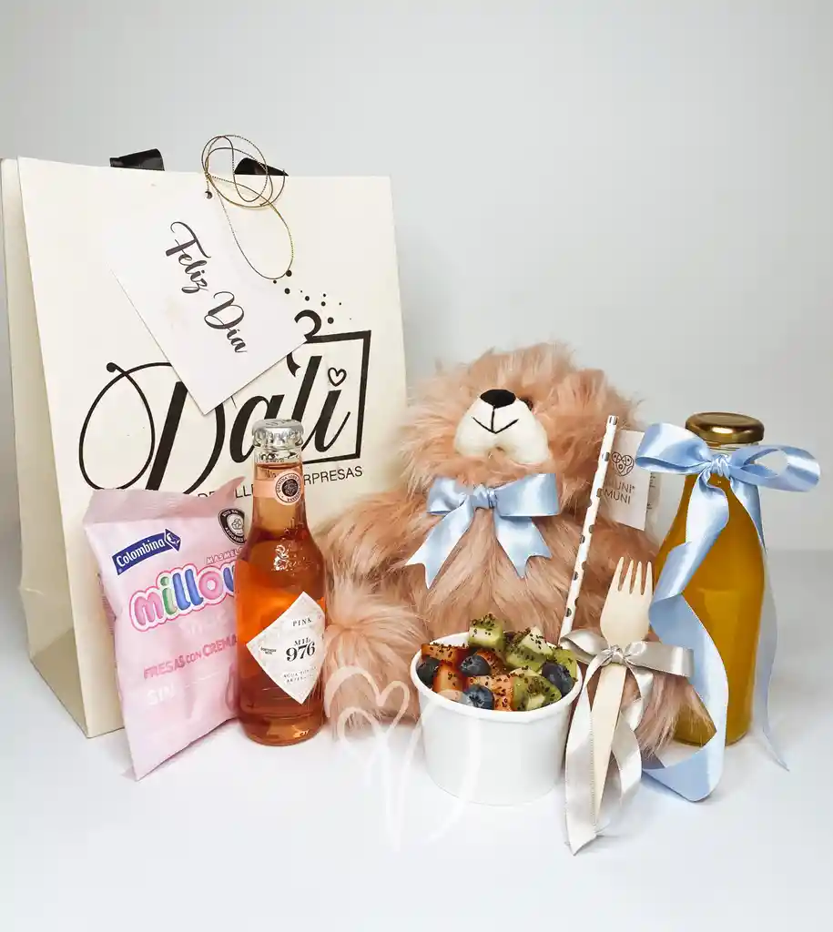 El Desayuno sorpresa fluorita incluye: 1 Peluche Deluxe mini Muni Muni (El color puede variar según disponibilidad), 1 Jugo de naranja natural o 1 Hatsu soda, 1 Porcion de fruta, 1 Agua tonica,1 Masmelos, Cubiertos y pitillo biodegradables, bolsa de regalo, lazo en la botella (El color puede cambiar dependiendo la ocasión y sexo) y carta dedicatoria. *Agregar mensaje para la tarjeta al pedido por el chat, de lo contrario irá una tarjeta genérica. *La decoración, complemento y colores de empaques irá de acuerdo a sexo (Hombre/Mujer) y motivo del detalle. NOTA IMPORTANTE: En este momento la bolsa se encuentra agotada, el desayuno será enviado con el mismo contenido en una canasta de madera con mantel.