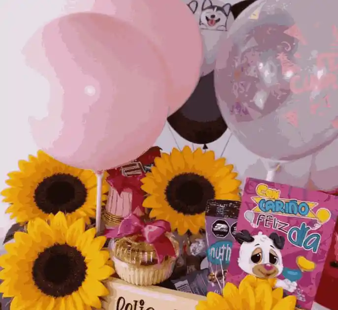 Contenido: 3 Girasoles + Ancheta 1 Mini Postre 1 Mani 2 Barra de Granola 2 Galletas 8 Mini Donas 2 Manzanas 1 Chocolate Grande 1 Bandeja de Fresas 1 TARJETA PERSONALIZADA