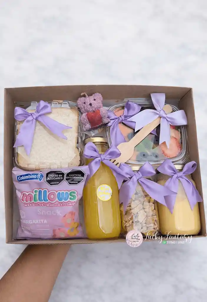 Desayuno sorpresa que contiene - Sandwich - Mix frutas - Botella con yogurt - Frasco con cereal - Jugo de naranja - Masmelos - Velita aromática - Galleta artesanal y snacks dulces, ideal para sorprender con un detalle especial 🎁