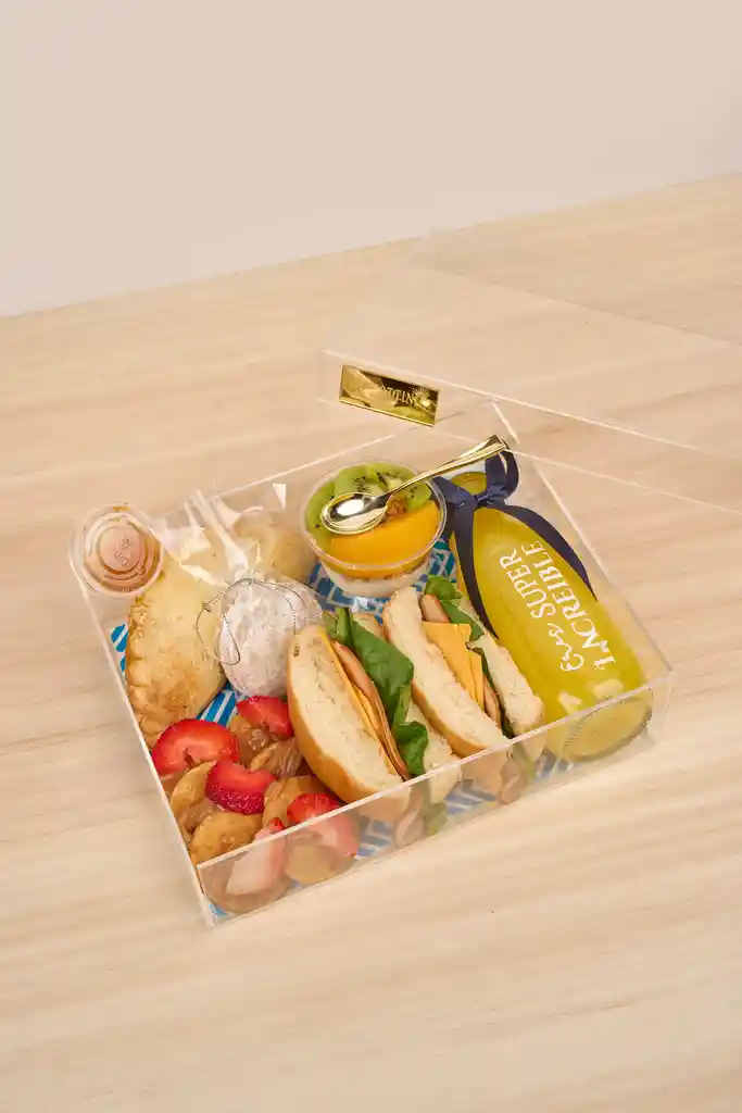 Box Standard Hombre: Cajita estampada con diseño maletín. Incluye: 1 jugo de naranja o smoothie de frutos rojos, 1 sándwich en pan artesano con jamón, queso doble crema, salsa de la casa y lechuga, 1 bowl de frutas, 1 paquete de papas Monterojo, Porción de palitroques, 1 Nutella mini, 1 tarjeta personalizada, 1 cubierto BIO y servilleta, 1 pitillo BIO