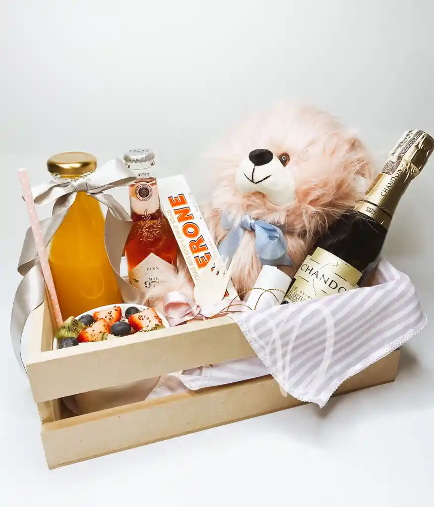 El Desayuno sorpresa Turquesa incluye: Canasta de madera con mantel, 1 Peluche Deluxe mini Muni Muni (El color puede variar según disponibilidad), 1 Vino espumoso Chandon 187ml, 1 Agua tonica, 1 Jugo de naranja o Hatsu te, 1 Porcion de fruta, 1 Tableta de chocolate Toblerone, Cubierto y pitillo biodegradables, lazo en la botella (El color puede cambiar dependiendo la ocasión y sexo) y carta dedicatoria. *Agregar mensaje para la tarjeta al pedido por el chat, de lo contrario irá una tarjeta genérica. *La decoración, complemento y colores de empaques irá de acuerdo a sexo (Hombre/Mujer) y motivo del detalle.