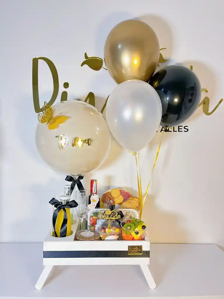 jugó de naranja fresco con pitillo , te hatsu, vino gato negro, una copa elegante, tabla de queso en madera redonda, wafflers con fresa y mini nutella, pancakes con vela, parfait, topper “feliz dia”,ensalada de fruta ,mesa blanca plegable ,globo burbuja con mensaje personalizado, 3 globos en helio.
