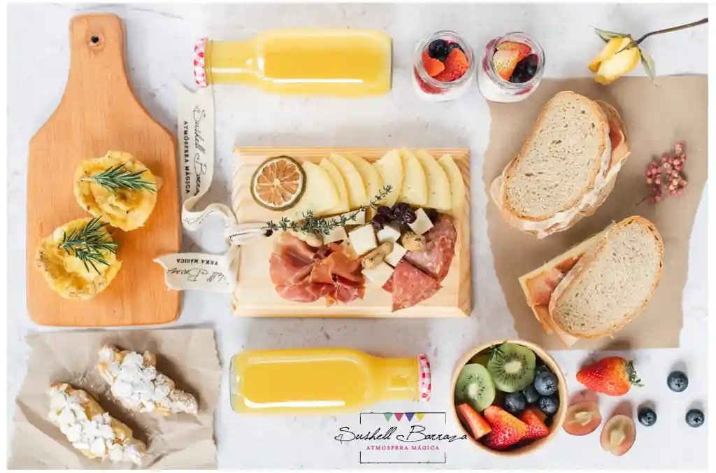 Desayuno para 2 Caja Pino 30x30, Tabla de Pino Jamones y Quesos Croassaint Almendras, Parfait Frutos Rojos, Sándwich Serrano, queso curado, Mozzarella, Muffin Huevo, Fruta, Jugo Naranja, Bouquete, Tarjeta.