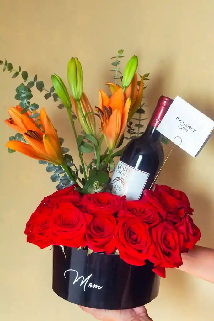 Arreglo en base de cilíndrica estilo vintage con rosas rojas gypsofilia y lirio blanca incluye vino