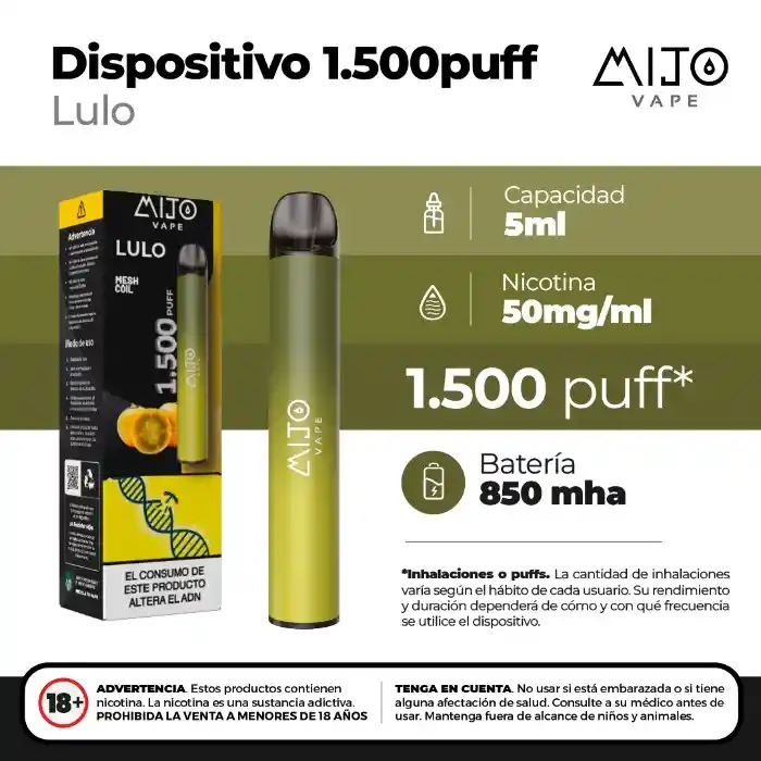 -Capacidad de líquido: 5ml -Batería: 850 mAh no recargable -Sales de nicotina: 50 mg (5%) -Puffs: Hasta 1500 -Contiene 1 unidad