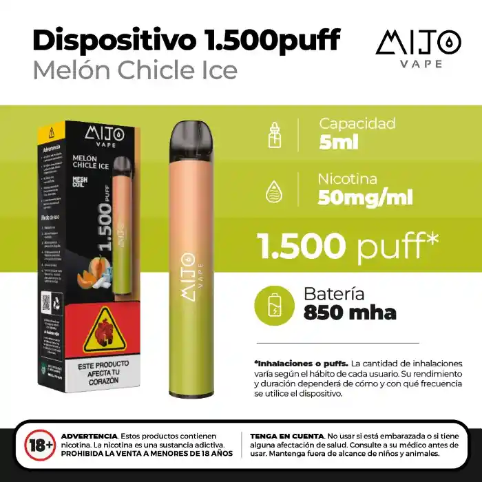 -Capacidad de líquido: 5ml -Batería: 850 mAh no recargable -Sales de nicotina: 50 mg (5%) -Puffs: Hasta 1500 -Contiene 1 unidad