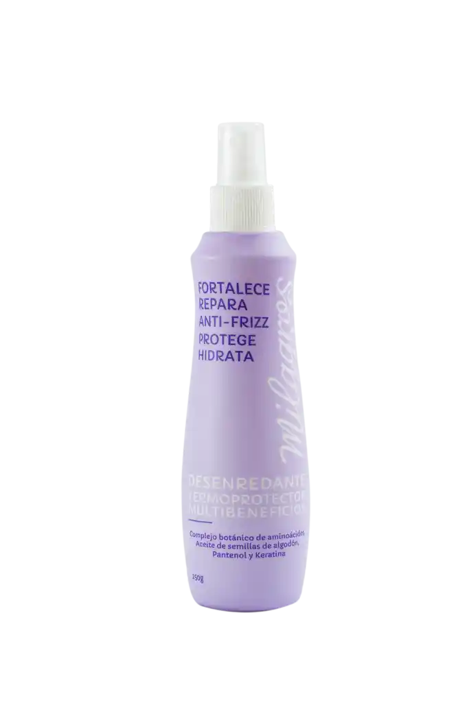 FORTALECE, REPARA, ANTI-FRIZZ, HIDRATA Y PROTEGE. BENEFICIOS Ideal para: todo tipo de cabello, cabellos grasos, delgados o gruesos, maltratados, con frizz y que se someten al uso frecuente de aparatos eléctricos. Se puede utilizar a partir de los 6 meses IDEAL Raíz grasa con puntas secas, totalmente graso, seco totalmente, todo tipo de cabello. ESTADO DEL CABELLO Excelente, normal, dañado, maltratado. Nuestro desenredante , termoprotector y perfume es una fórmula de alto desempeño que acondiciona proporcionado brillo, protección a la fibra capilar de los daños causados por el uso de planchas y secadores, desenredante, mejora la apariencia de la fibra capilar, fortalecimiento, control caída. Perfecto para desenredar los nudos del cabello que se forman habitualmente en la fibra capilar de las personas con cabello delgado. Puede ser usado por niños y adultos y todos los tipos de cabellos . INGREDIENTES Pantenol, aceite de semillas de algodón , keratina , pulpa de coco , complejo botánico de aminoácidos y extractos vegetales. Formula 0% grasosa Fragancia de larga duración Agita siempre antes de usar . Para usarlo como desenredante , aplica en todo el cabello y deja actuar mínimo 5 minutos antes de empezar a peinar.