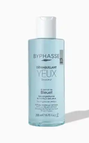 La zona de los ojos es muy sensible, por lo que requiere una limpieza minuciosa y delicada a la vez. Por ello es recomendable utilizar un producto específicoque sea eficaz y suave para esta zona, además del uso de una crema para el contorno de ojos una vez la piel está limpia y desmaquillada. El desmaquillante de ojos Douceur de Byphasse, con extracto de aciano, limpia con suavidad y elimina eficazmente el maquillaje. Su fórmula vegana, enriquecida con extracto de aciano, ofrece suavidad extra para la piel del contorno de ojos y asegura una limpieza perfecta sin dejar efecto graso.