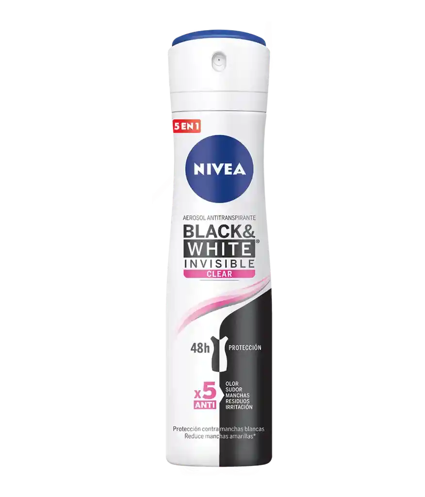 Desodoarnte en Aerosol Nivea Black and White Invisible Clear, 48 horas de prtotección, 5 anti: olor, sudor, manchas, residuos, irritación. Reduce manchas amarillas y protección contra manchas blancas.