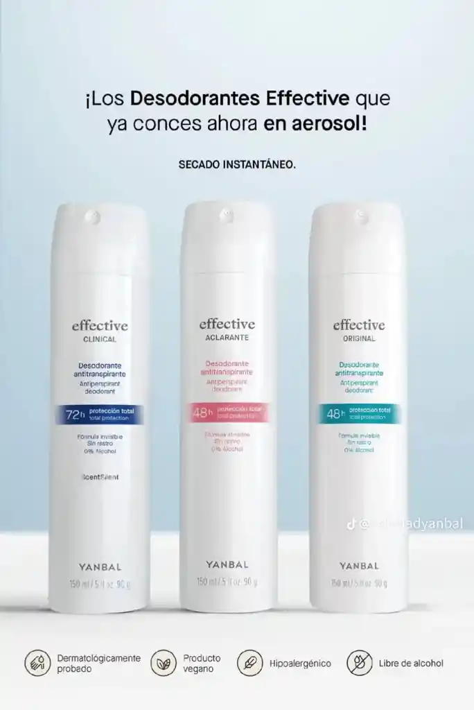 Desodorante Antitranspirante en Aerosol Aclarante Effective Yanbal 150 ml con hasta 48 horas de protección contra la transpiración y el mal olor: mantiene la piel fresca y libre de humedad, contribuyendo a una sensación de limpieza durante todo el día. Además, es hipoalergénico, 0% alcohol y no irrita la piel. Controla la transpiración y el mal olor, para una piel fresca y libre de humedad. Gracias a sus agentes antitranspirantes y desodorantes, este aerosol, de fácil aplicación y que no mancha la ropa, es una excelente alternativa de uso diario que te protege sin causarte irritación. El desodorante ideal para refrescarte y olvidarte del mal olor en las axilas.