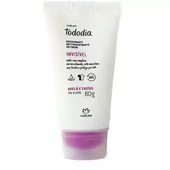Desodorante en crema avellana y casis Tododia. Beneficios: • No deja residuos blancos en los tejidos oscuros, ni manchas amarillentas en los tejidos blancos. • Cuidado de la piel exclusivo complejo hidratante con vitamina E: protege, cuida e hidrata. • Protección prolongada por hasta 48 horas contra efectos del sudor. Posee aplicador de fácil uso. Contenido 80 g.