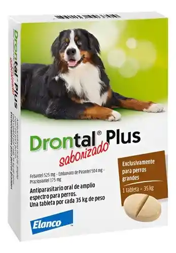 Drontal® PS Saborizado Perros Grandes es un endoparasiticida de amplio espectro especialmente diseñado para perros con peso de hasta 35 kg, que actúa contra las formas maduras e inmaduras de los siguientes nemátodos, céstodos y protozoarios en perros: Nemátodos: Toxocara canis, Toxascaris leonina, Uncinaria stenocephla, Ancylostoma caninum, Ancyslostoma braziliense, Trichuris vulpis. Céstodos: Echinococcus granulosus, Echinococcus multilocularis, Dipylidium caninum, Taenia hydatigena, Taenia pisiformis, Multiceps multiceps, Joyeuxiella pasqualei, Mesocestoides spp. Protozoarios: Giardia spp; para el tratamiento de Giardia, utilizar por 3 días seguidos. Modo de Uso: Drontal® PS Saborizado Perros Grandes se administra por vía oral directamente en la boca de la mascota o mezclado con el alimento o un pedazo de carne. No es necesario tomas medidas dietéticas ni suprimir la ración a los animales. Una tableta por cada 35 kg de peso vivo.