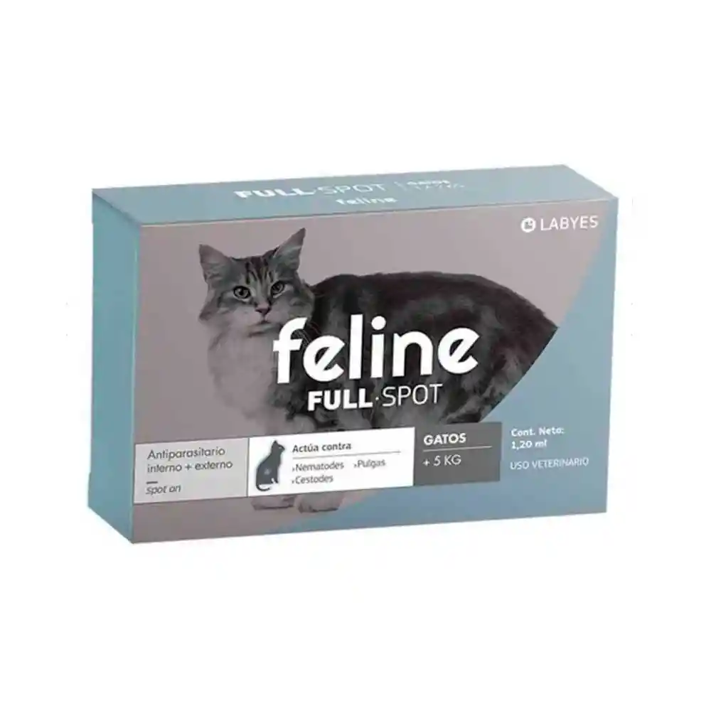 - Con Feline Fullspot la tolerancia digestiva no representa un desafío, se aplica en forma de spot-on, directamente sobre la piel, en un área de distribución desde la nuca hasta la cruz, a fin de evitar el lamido del producto. - Su efectiva formulación elimina las pulgas y los parásitos internos que frecuentemente afectan a los gatos. - La Ivermectina, lactona macrocíclica, tiene potentes efectos contra nematodes y ácaros de la sarna. - El Praziquantel, derivado sintético de la isoquinolina-pirazina, ejerce su actividad frente a trematodes y cestodes. - El Imidacloprid, es un neonicotinoide con potentes efectos pulguicidas y rápido poder de volteo. - Feline Fullspot desparasita interna y externamente al paciente felino sin generarle estrés, gracias a su aplicación tópica.