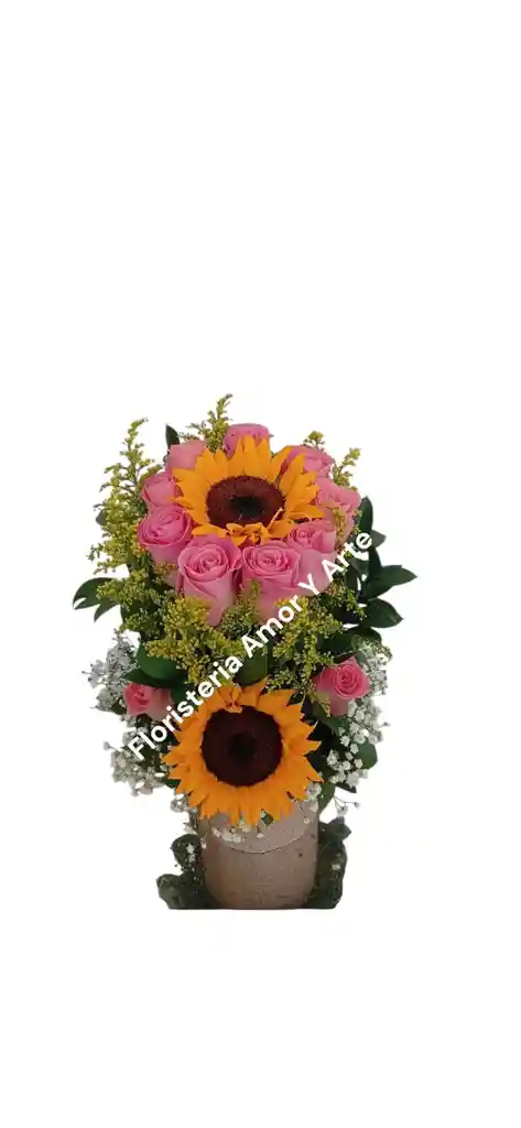 hermoso sembrado en base de madera redonda de lujo con 12 rosas rosadas dos girasoles y follajes.