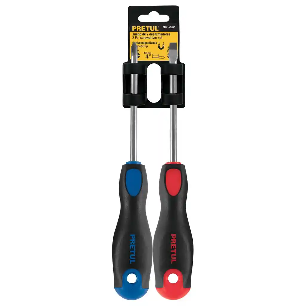 Dúo de desarmadores 1/4" x 4" mango Comfort Grip, Pretul • Barra redonda de acero • Mango comfort grip con orificio para colgar • Marcado y código de color para fácil identificación de medida y punta Especificaciones Número de piezas 2 Medida de punta 1/4" (6.3mm) Empaque individual Tarjeta plástica