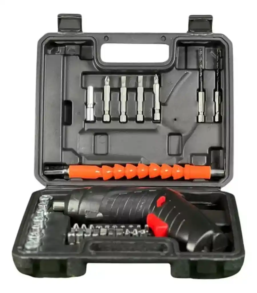 El Taladro Destornillador Inalámbrico 3.7V con 45 accesorios y maleta es la herramienta ideal para tus proyectos de bricolaje, ofreciendo comodidad y eficiencia sin necesidad de cables. Con una velocidad máxima de 220 rpm y un torque de 3 Nm, permite realizar trabajos precisos con facilidad. Su diseño ergonómico y resistente garantiza un manejo cómodo, mientras que su completo set de accesorios se adapta a diversas tareas. Incluye una práctica maleta para un almacenamiento seguro y ordenado. Perfecto para profesionales y aficionados que buscan versatilidad y rendimiento en una sola herramienta. Ficha Técnica: Frecuencia: 50 Hz x 60 Hz Dimensiones estuche: 20 cm x 17 cm x 6 cm Dimensiones del destornillador: 15 cm x 13 cm x 4 cm Material: ABS Voltaje: 3.6V Atornillador eléctrico de impacto. Es inalámbrico. Velocidad de rotación de entre 220rpm y 220rpm. Torque máximo: 3Nm. Incluye eje flexible. ** _Para defectos de fábrica o retractos: \_Por favor revise el producto apenas lo reciba y antes de usarlo. No aplican ley de retracto o defectos de fábrica luego de usar el producto. Se manejan máximo 5 días para reportar defectos de fábrica (por ejemplo, producto funciona mal, piezas faltantes, rotas, etc). Para hacer efectiva la devolución el producto debe devolverse con el empaque original, el cual debe estar en buen estado, incluir todos los documentos y las partes completas y sin daños.