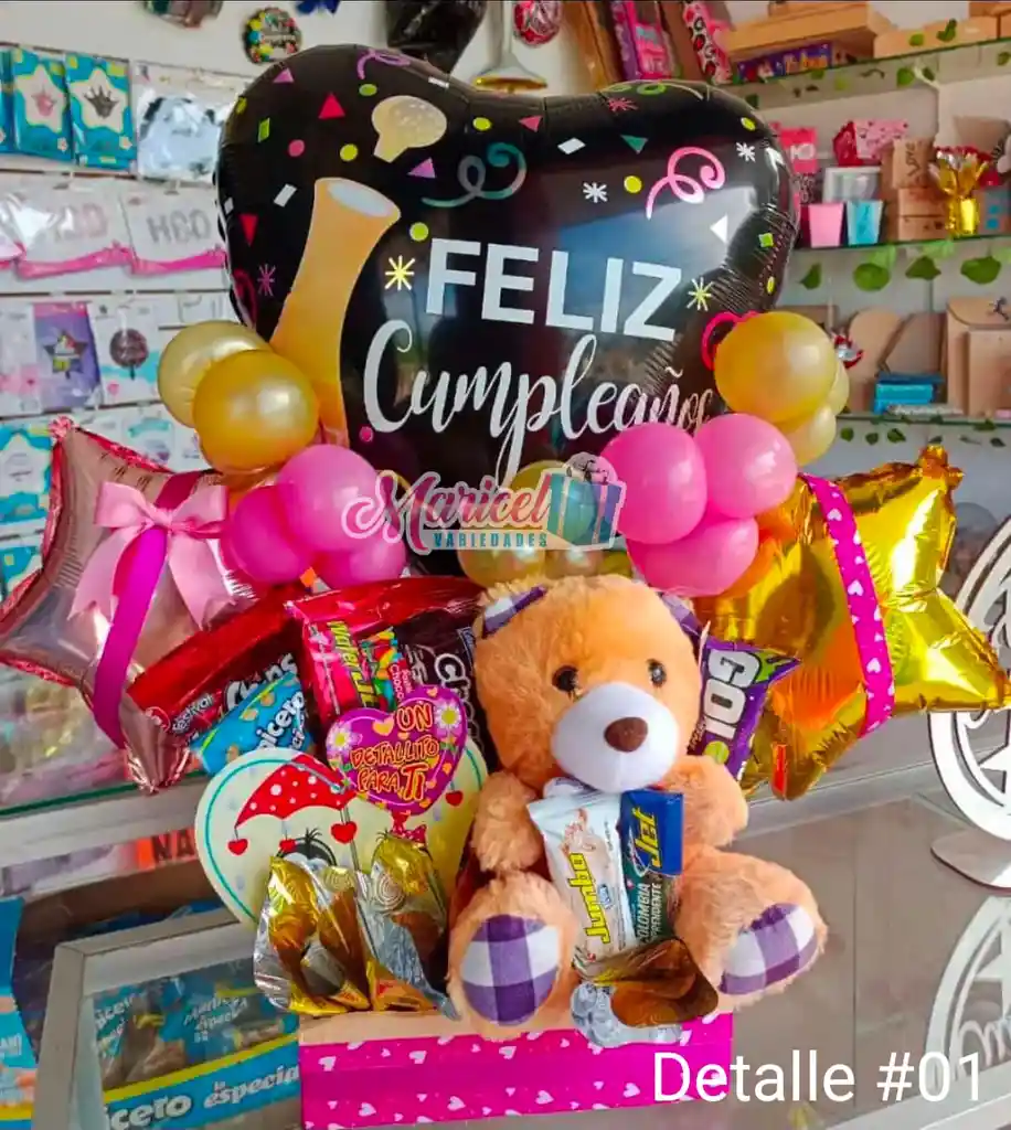 elaborado en base de madera golosinas surtidas peluche pequeño un globo grande metalizado dos globos medianos metalizados cintas decorativas y tarjetas personalizadas