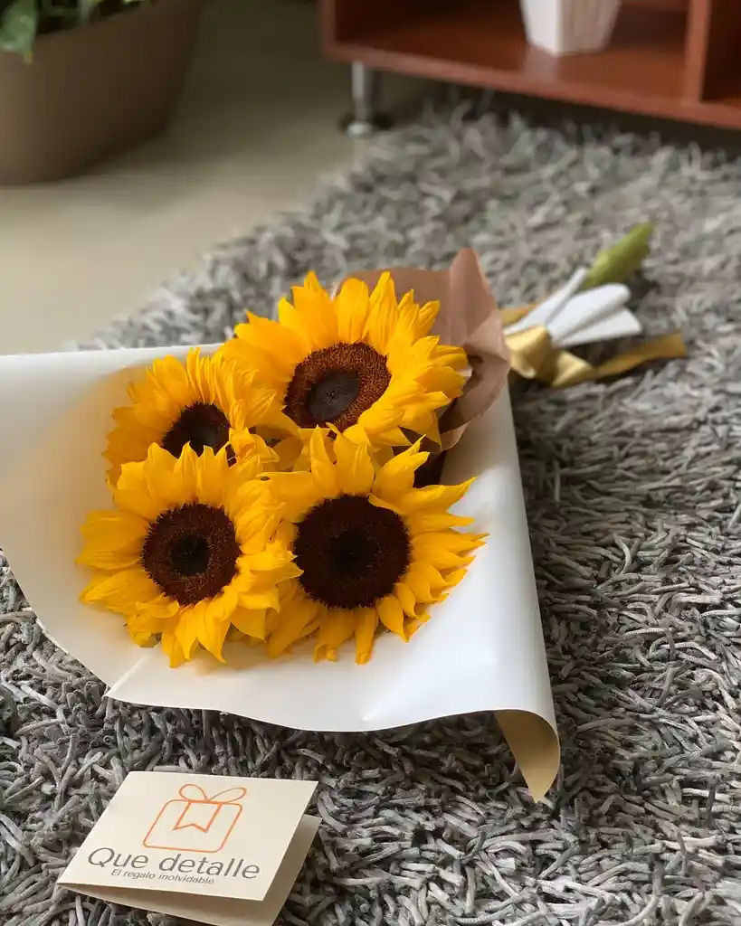 -4 Girasoles -Papel Especial para ramo -Papel seda -Cinta de tela -Tarjeta de color Amarillo ideal para el Agradecimiento