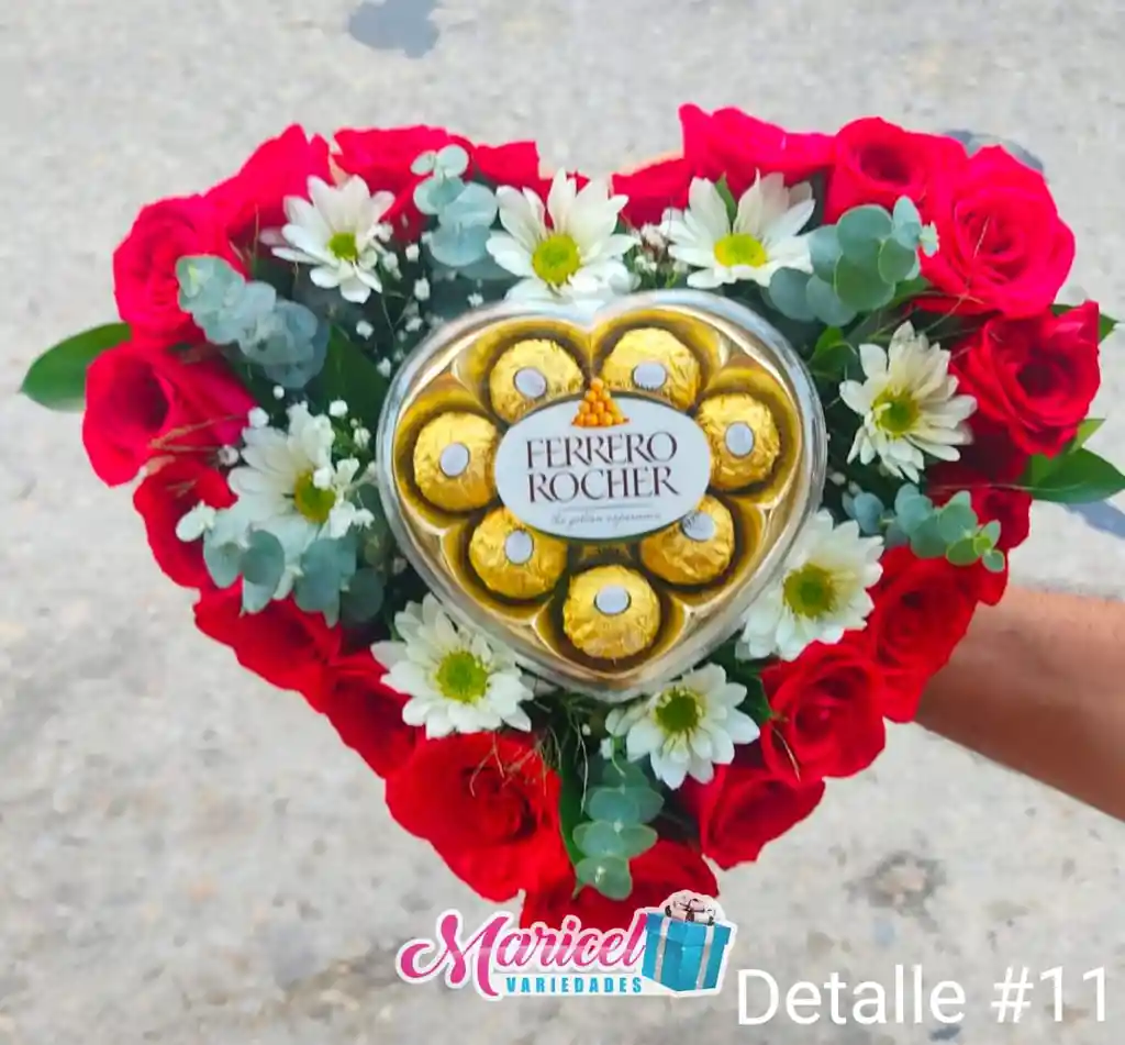 elaborado en caja corazón,con rosas, margaritas, eucalipto, gypsofilia, ruscus, follaje, chocolate Ferrero Rocher x 8 unidades