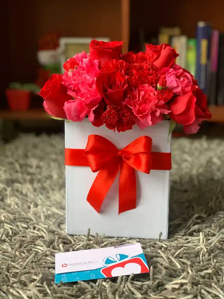 -12 rosas -Claveles -Recipiente de lujo -Cintas de tela -Tarjeta